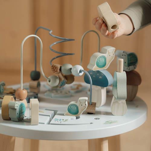 Stand up to play! Discover the many activities this table has to offer. Bring the beads along the spiral from one side of the enchanted forest to the other side. Or build a tower and fill the forest with trees of joy. Complete the puzzle, turn the wheels and help the lovely animals cross the Forest Friends woodlands. This wooden multi-activity table challenges your little one in many ways. There are 5 activities to explore that each support the development of fine motor skills. Thanks to the safe and balanced design, the activity table also encourages standing up. And staying up! Because the many features will keep your toddler engaged for a while. Assembly by an adult required.