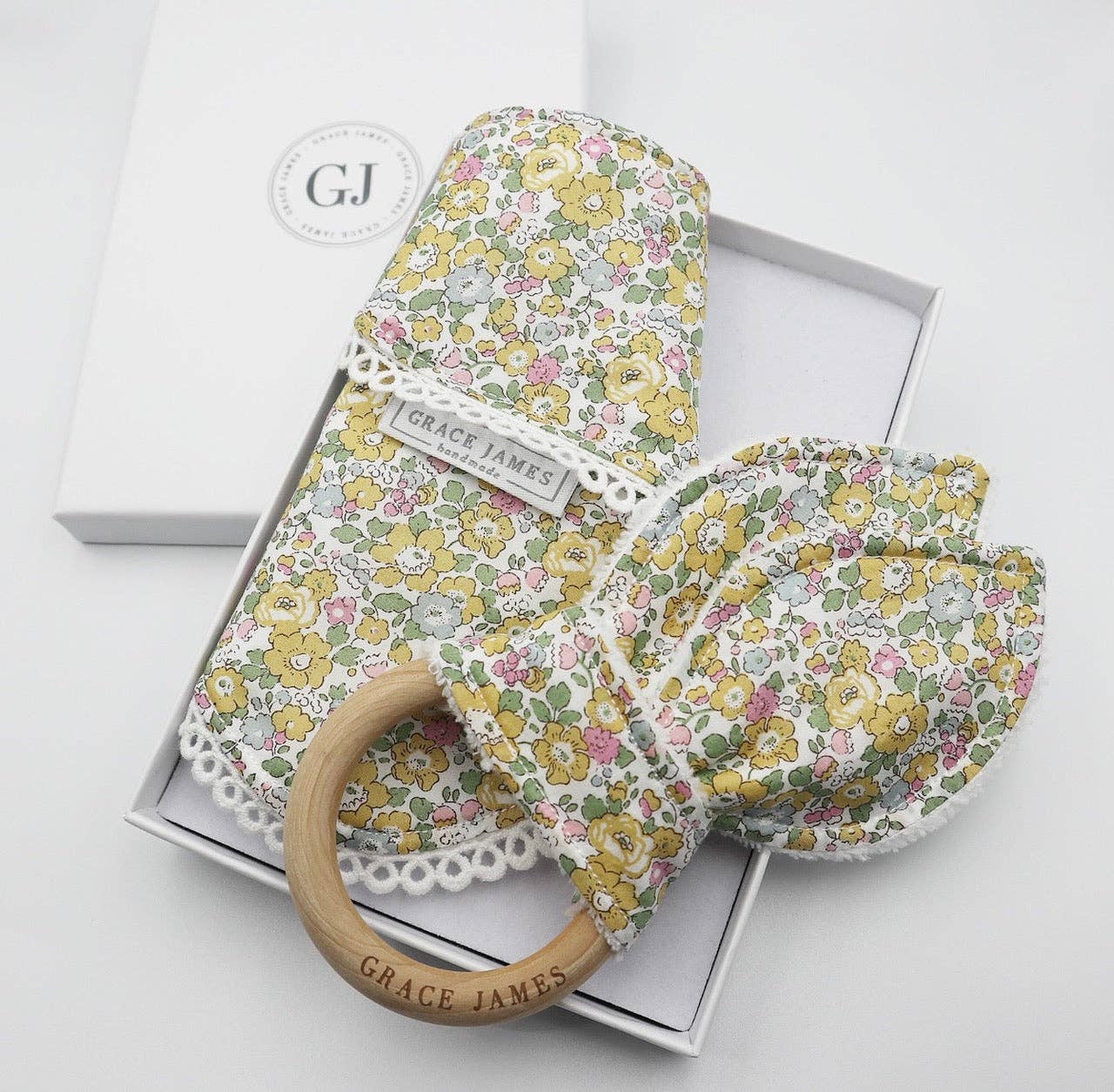 This stunning baby bib gift box is a perfect addition to a little ones wardrobe. It features an organic bamboo dribble bib and a Grace James maple wooden teether in Liberty's newest fabric 2023 Betsy Ann Yellow. The fabric is a beautiful, silky Liberty London cotton Tana Lawn which is durable yet delicate in print.