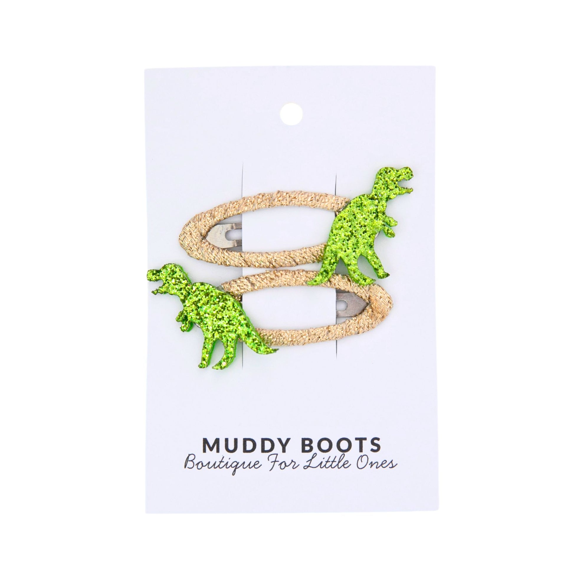 Perfect for little adventurers, these green dinosaur toddler hair clips add a playful sparkle to any outfit! The glittery dino design sits on a golden clip base, making them both eye-catching and practical for everyday wear or special occasions.