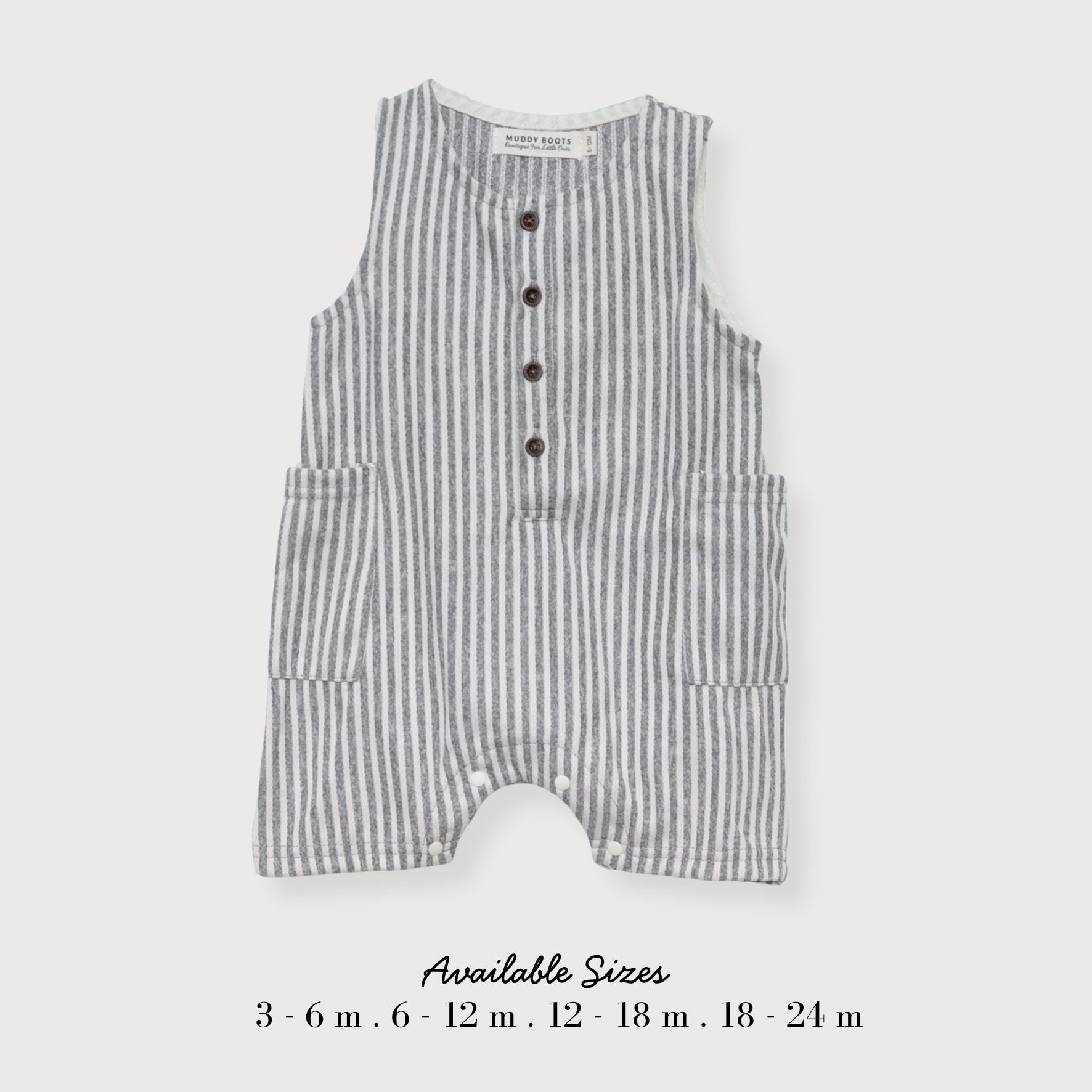 The classic stripe, wooden-style buttons, and oversized pockets give it timeless charm — while the popper fastenings underneath keep things practical for busy days.
