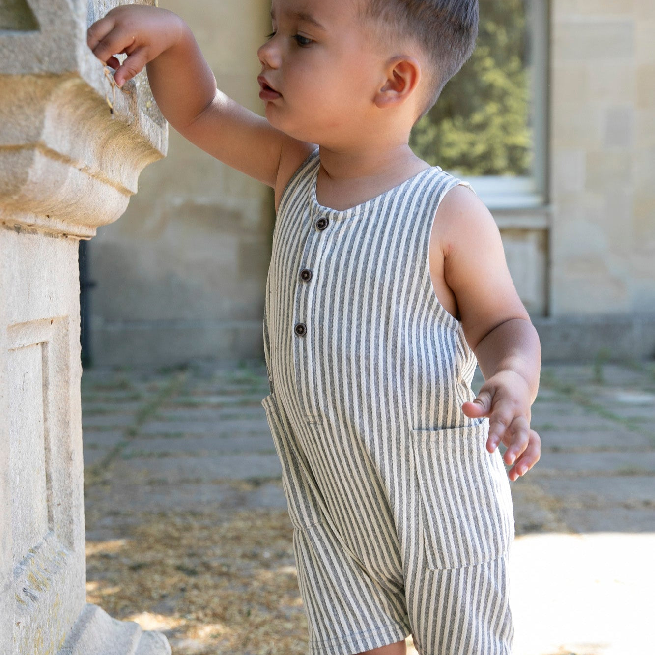 An effortless all-in-one for warm weather adventures. This lightweight cotton romper is soft, breathable, and designed with play (and easy changes) in mind.