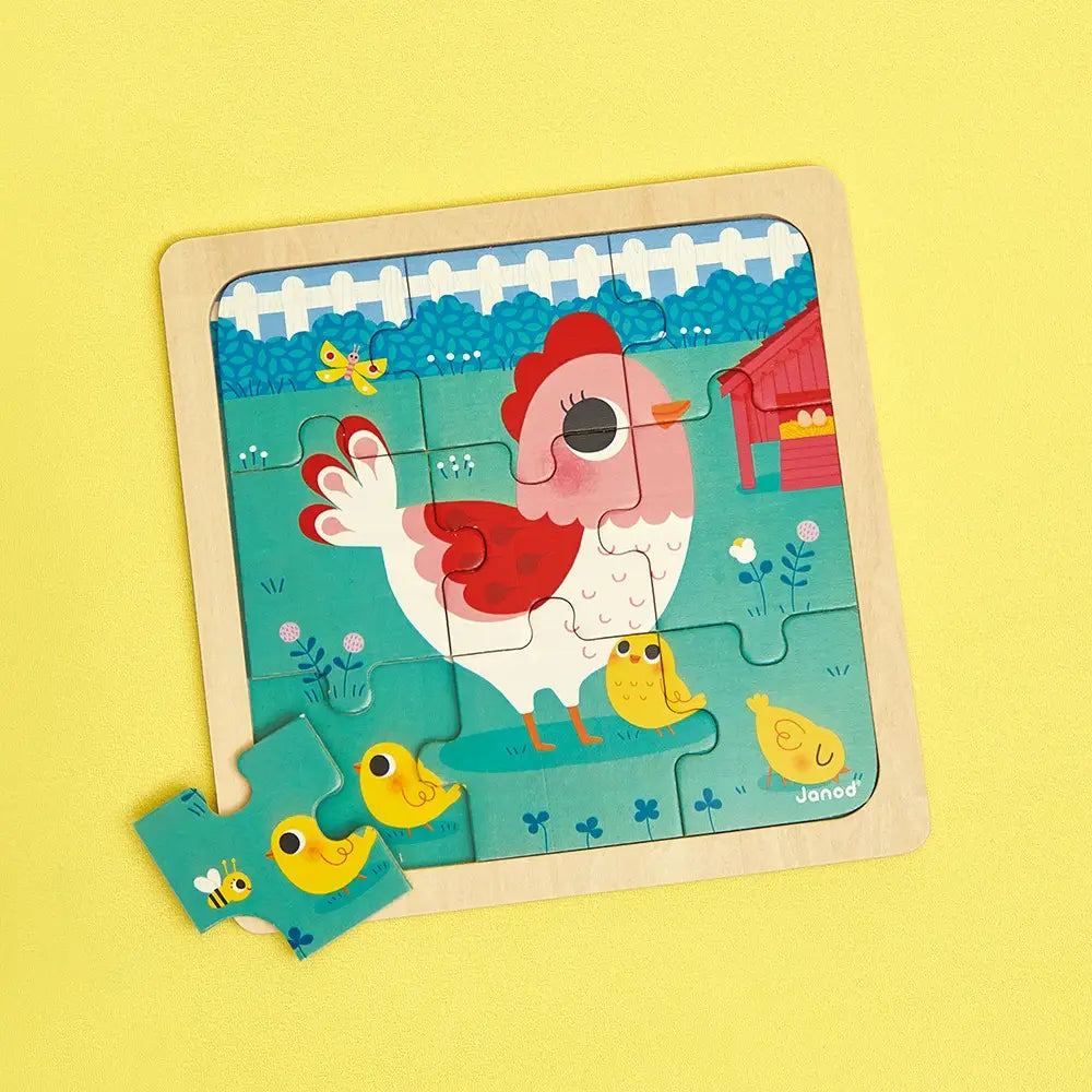 Cluck, cluck, cluck, the cute little chicken! This colourful puzzle features Henriette, a chicken with her chicks. It consists of 9 wooden pieces and a recess for easy removal of the pieces. Underneath the puzzle is a printed template ideal for helping little ones. This fun puzzle will help your child develop fine motor skills, concentration and independence. Early-years toy made using FSCTM wood, for children from 18 months.