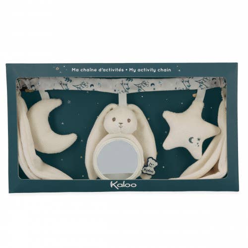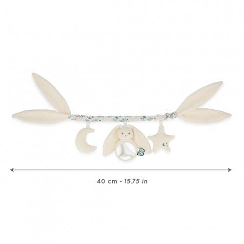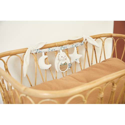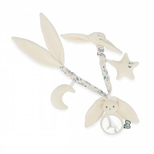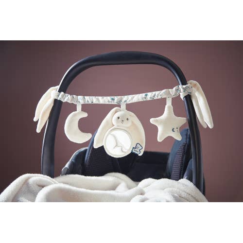 This lovely cream Lapinoo activity chain of 14,75 inch lenght, easily attaches to a stroller or car seat with its soft, large ears. It becomes the perfect ally to entertain baby during outings. Each element of the chain has been designed to stimulate and help to gently awaken the baby. The moon features crinkle paper, while the star holds a small rattle, and the mirror on the rabbit give baby the opportunity to develop his senses through the use of soft materials. Simple and practical, it will accompany baby on all his travels. Machine wash at 30°. From birth.
