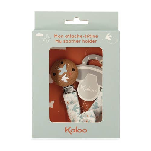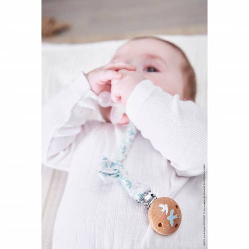 This attractive 6,44 inches soother holder made of two materials, one side in cotton gauze, is perfect for a sweet and sophisticated birth gift. With its delicately printed dove-coloured wooden hook, it accompanies baby wherever he goes. Its dove print gives it a delicate touch.