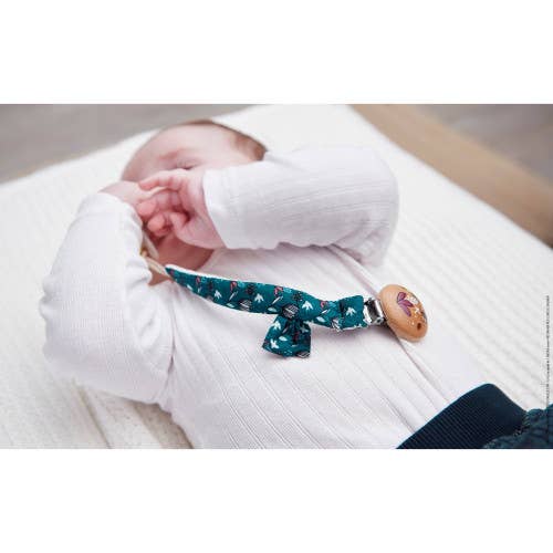 This attractive 6,44 inches soother holder made of two materials, one side in cotton gauze, is perfect for a sweet and sophisticated birth gift. With its delicately printed wooden hook in natural colours, it accompanies baby wherever he goes. Its nature print gives it a delicate touch.