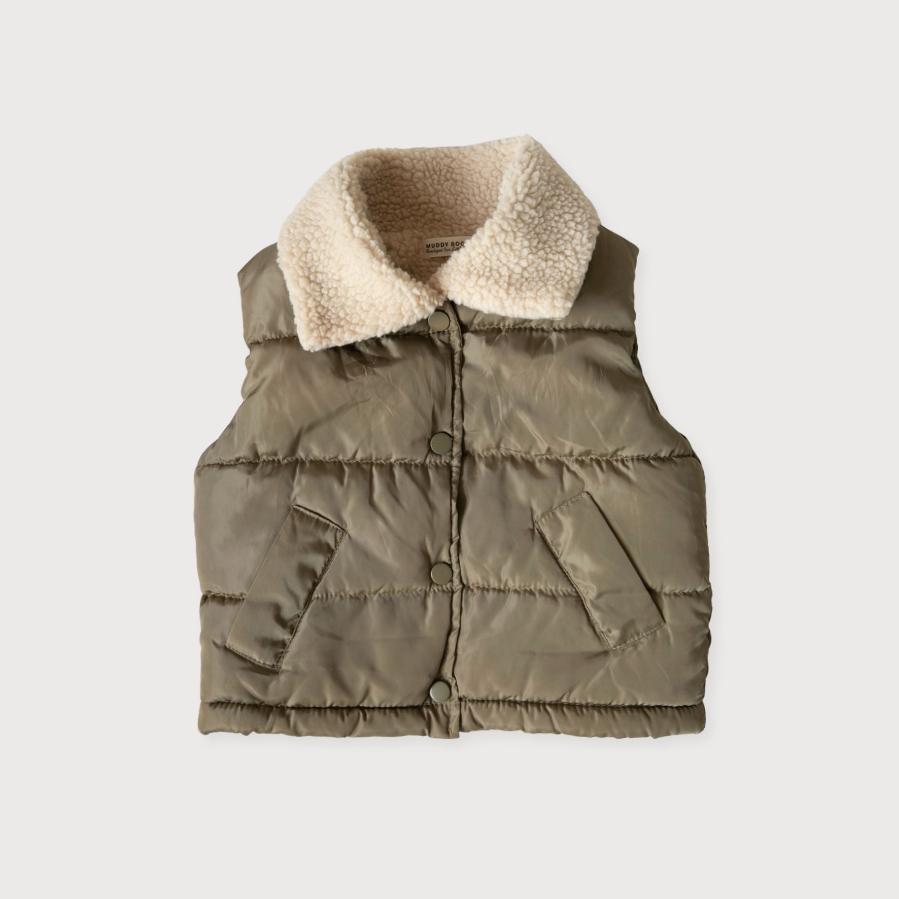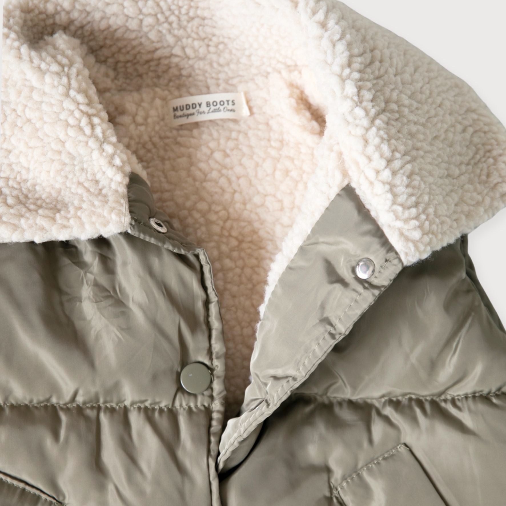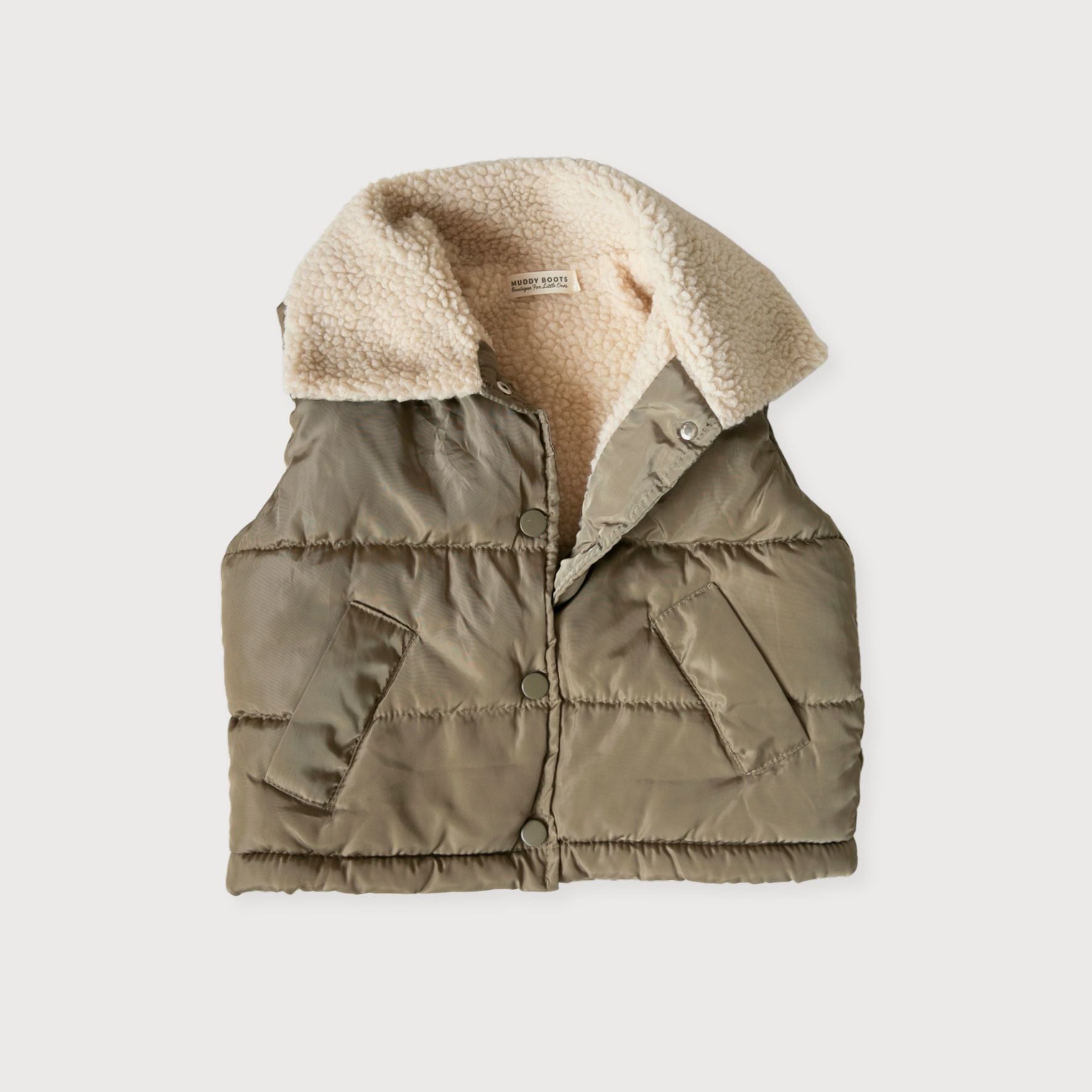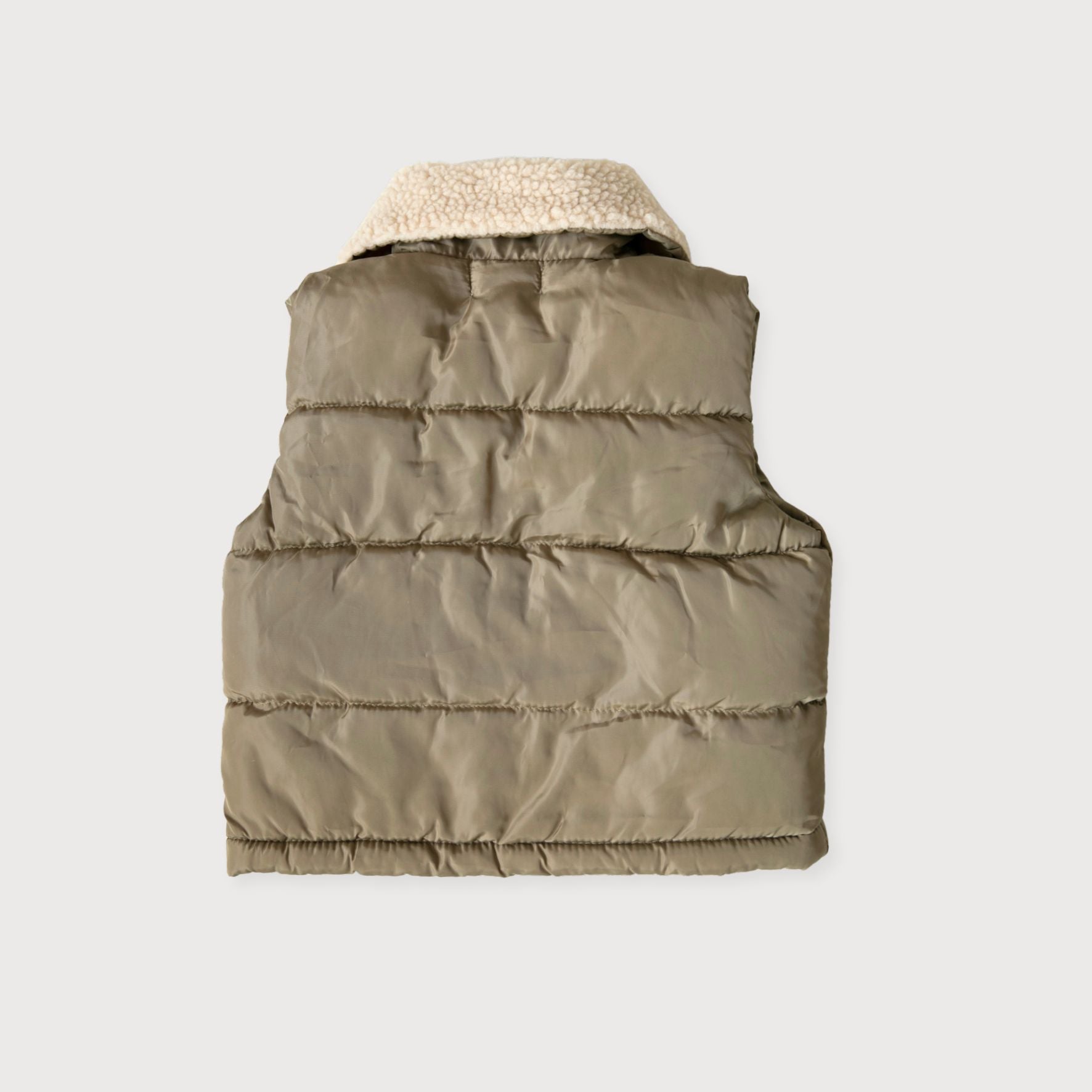A versatile outer layer for crisp days. This khaki padded gilet is lined with cosy shearling, complete with a warm collar and popper fastening to keep little ones snug. Lightweight yet insulating, it’s ideal for layering over jumpers, cardigans, or knits on autumn walks and winter outings.