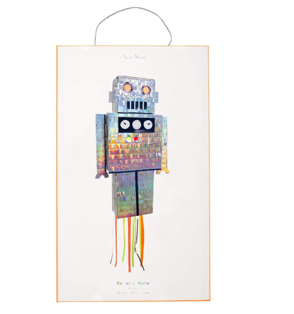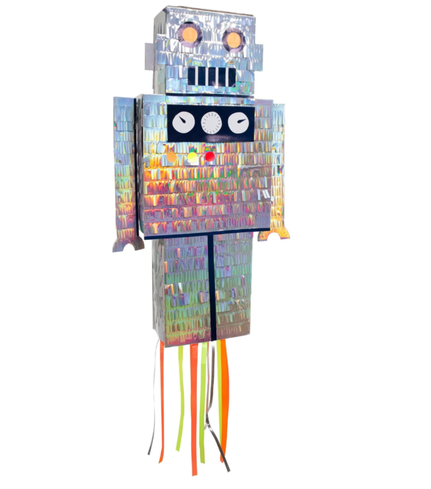 This shimmering robot piñata will make your party a smashing success! Featuring a shiny silver foil body and colourful ribbons to pull.