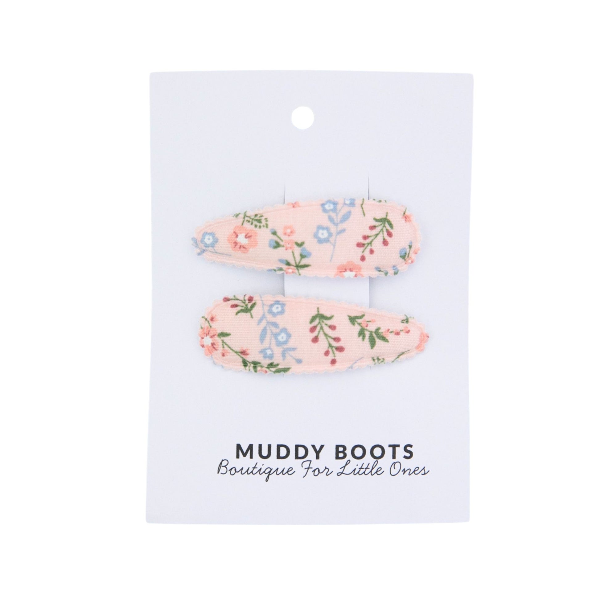 Bring a touch of spring to your little one’s hairstyle with these adorable pink floral meadow hair clips. Each clip is covered in soft pink fabric decorated with delicate sprigs of blue, green, and red blossoms, creating a sweet and timeless look. The scalloped trim adds an extra dainty detail, making them perfect for everyday wear or special occasions.