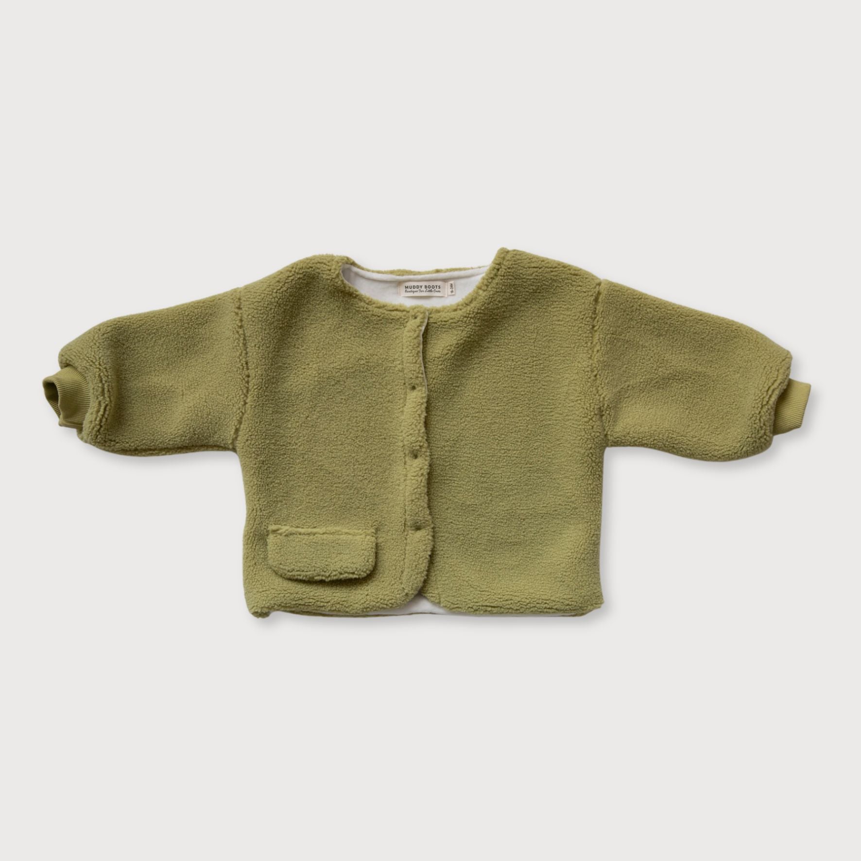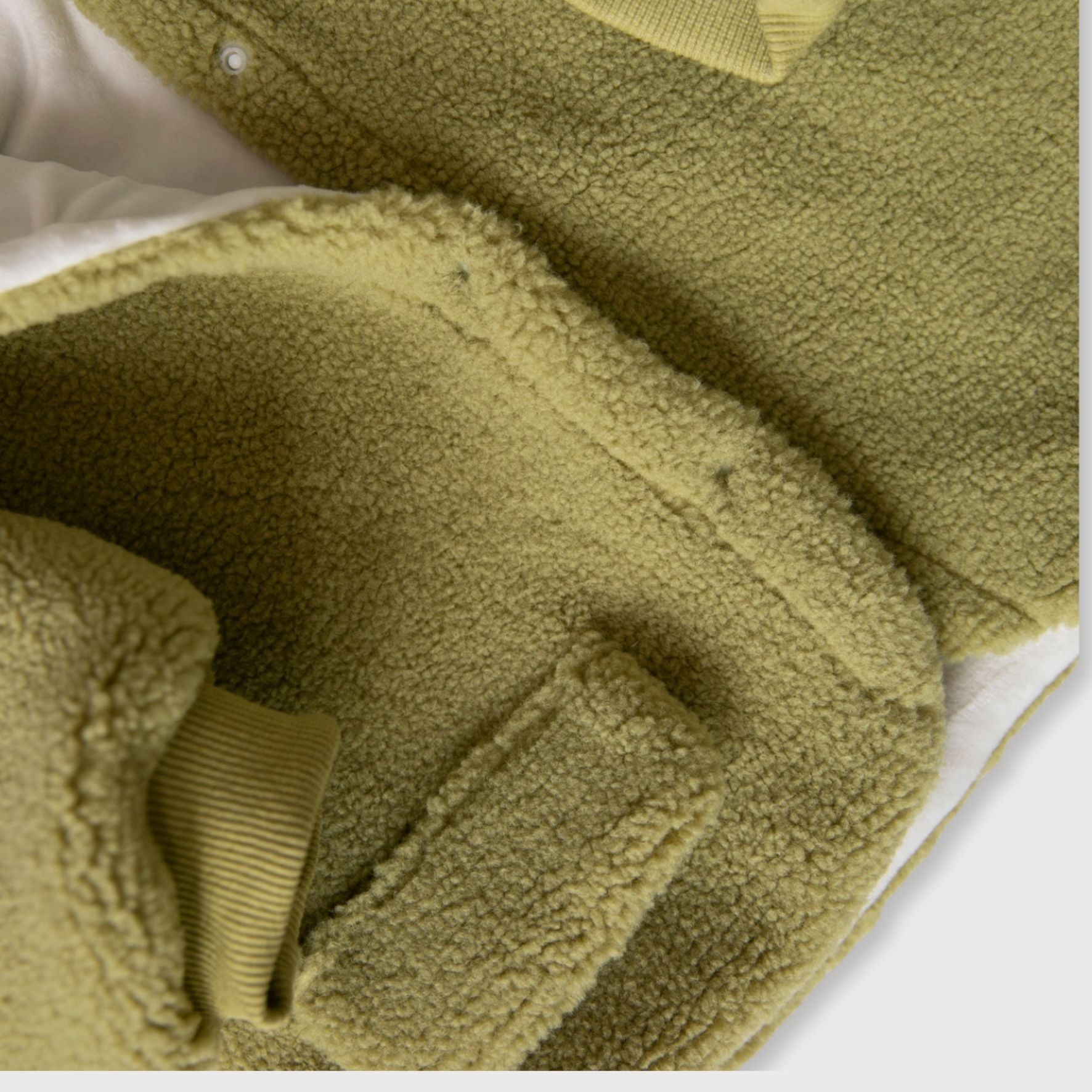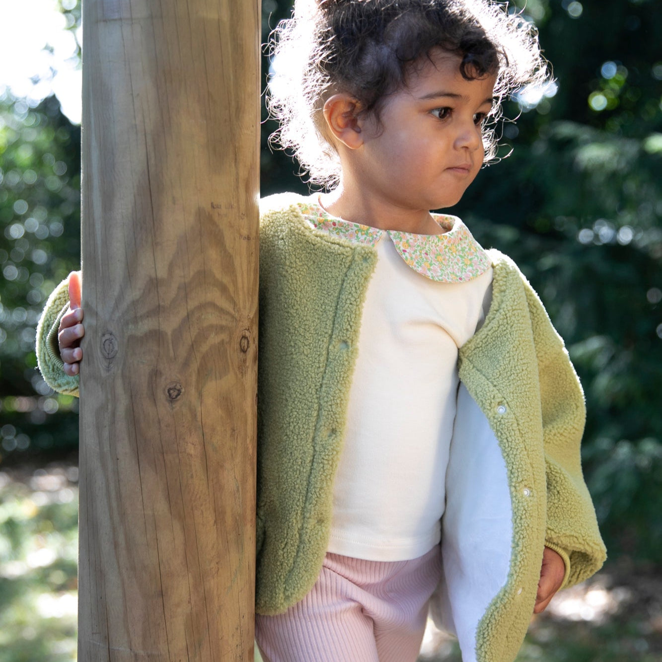 A cosy layer for cooler days. This olive green bouclé jacket is crafted from soft teddy-style fabric with a snug cotton lining, keeping little ones warm through autumn strolls and winter adventures. Designed with ribbed cuffs, front poppers, and a handy pocket, it’s the perfect throw-on jacket for nursery runs, park outings, and layering over knitwear.
