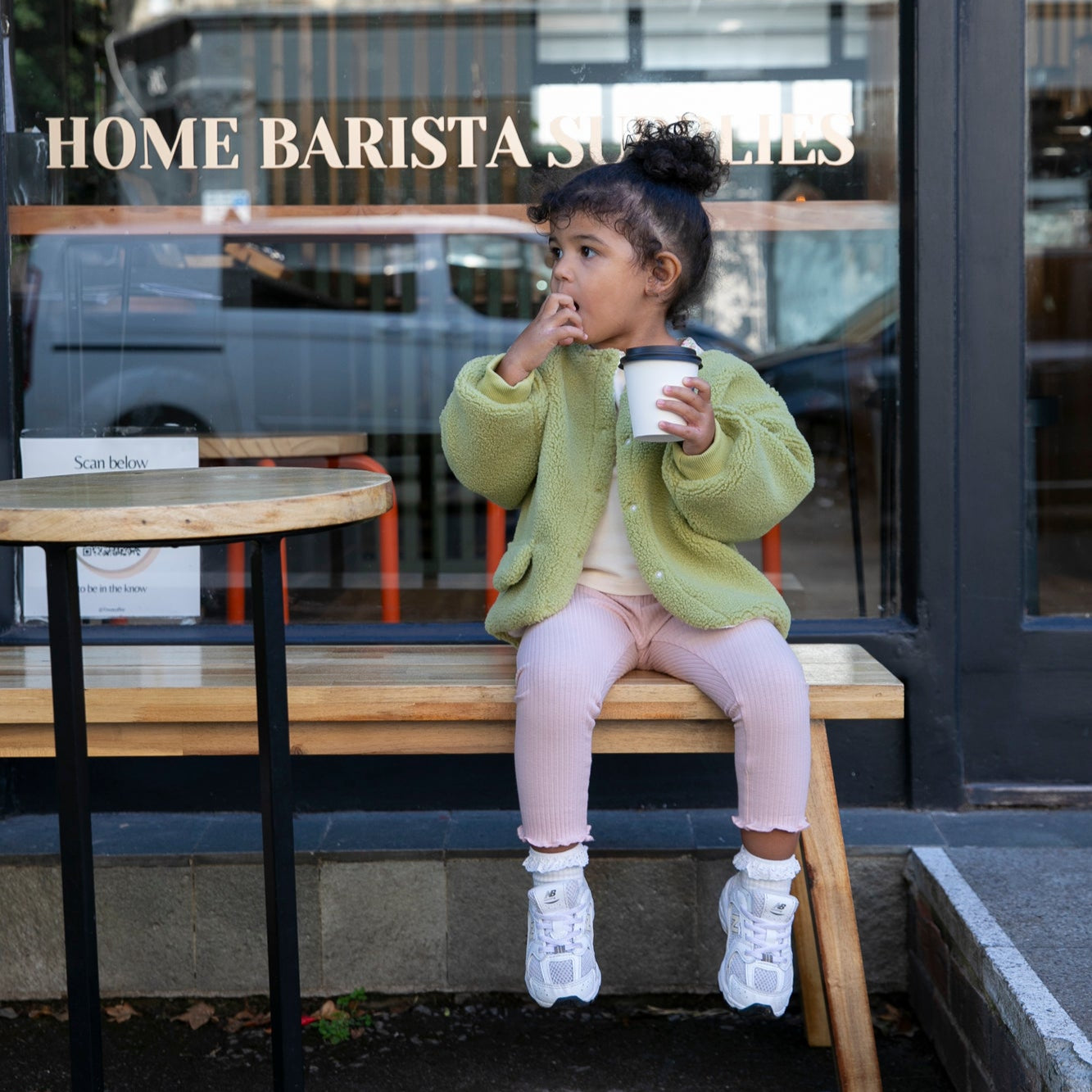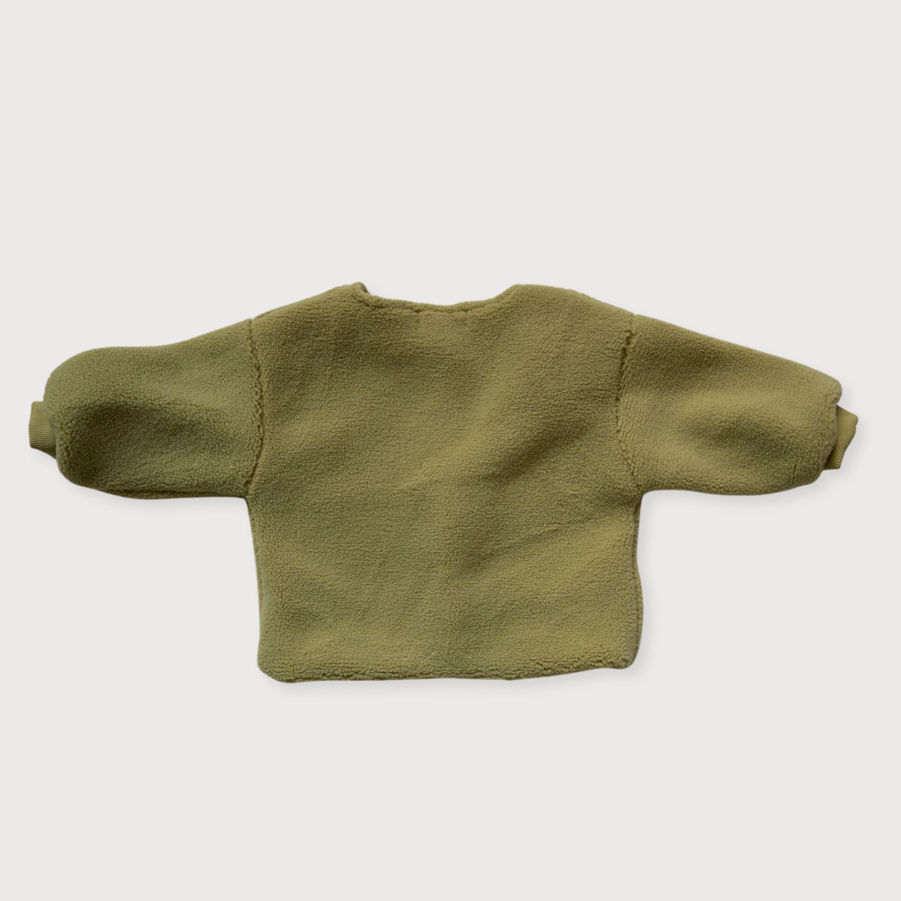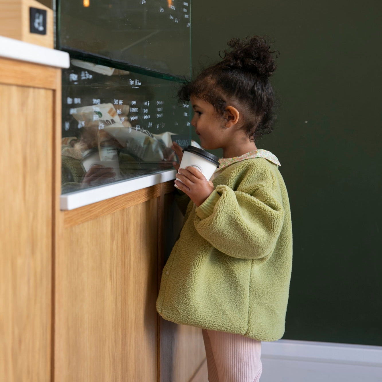 A cosy layer for cooler days. This olive green bouclé jacket is crafted from soft teddy-style fabric with a snug cotton lining, keeping little ones warm through autumn strolls and winter adventures. Designed with ribbed cuffs, front poppers, and a handy pocket, it’s the perfect throw-on jacket for nursery runs, park outings, and layering over knitwear.