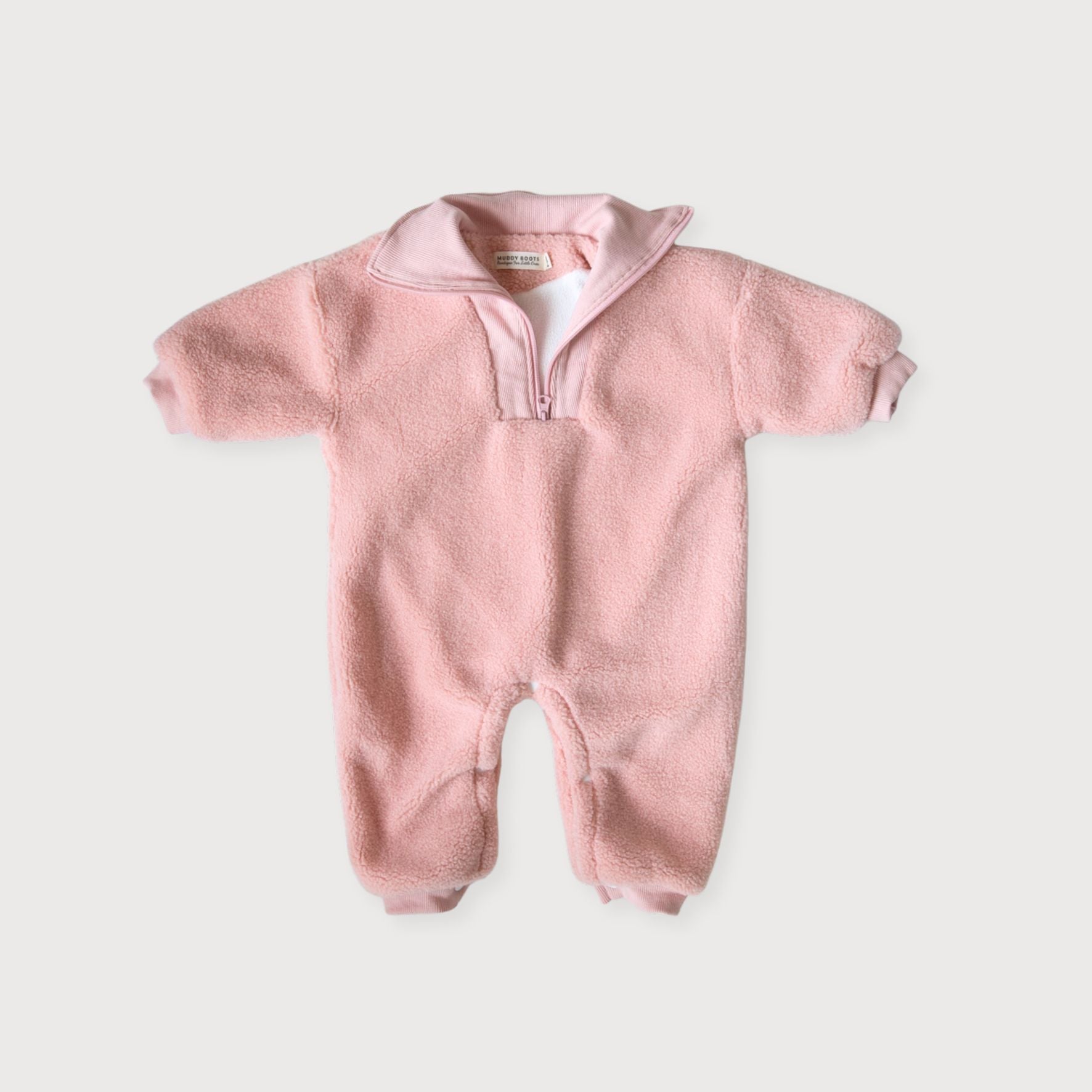The ultimate cosy layer for colder days. This pink fleece all-in-one is fully lined and features a half-zip front for easy dressing. With ribbed cuffs, poppers for easy changes, and a stand collar, it keeps little ones snug from head to toe — perfect for pram walks, playdates, or lounging at home.