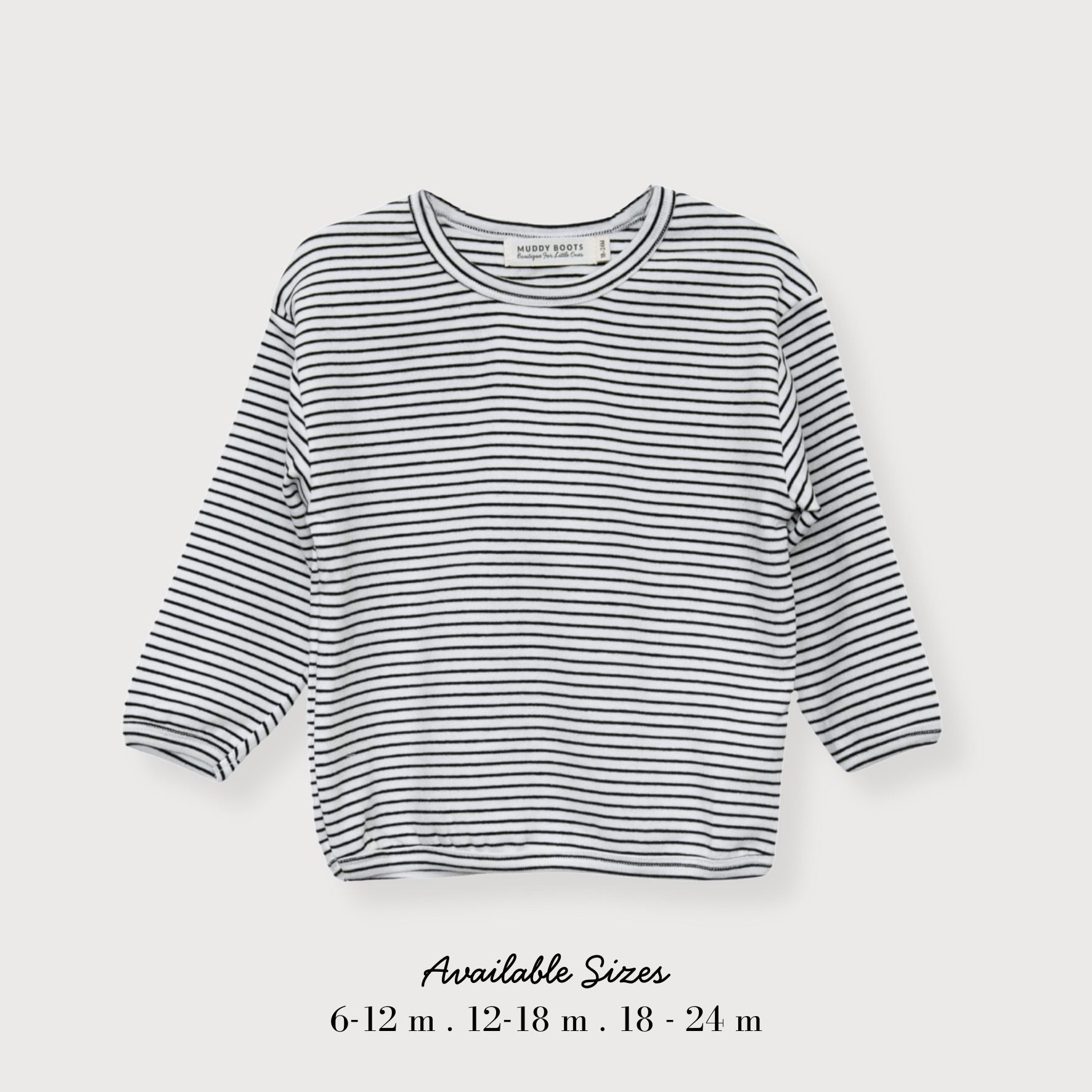 Timeless, easy, and endlessly wearable. This classic black-and-white striped top is made from soft cotton with a relaxed fit and gentle stretch — ideal for everyday adventures, layering under dungarees, or dressing up with smart trousers.