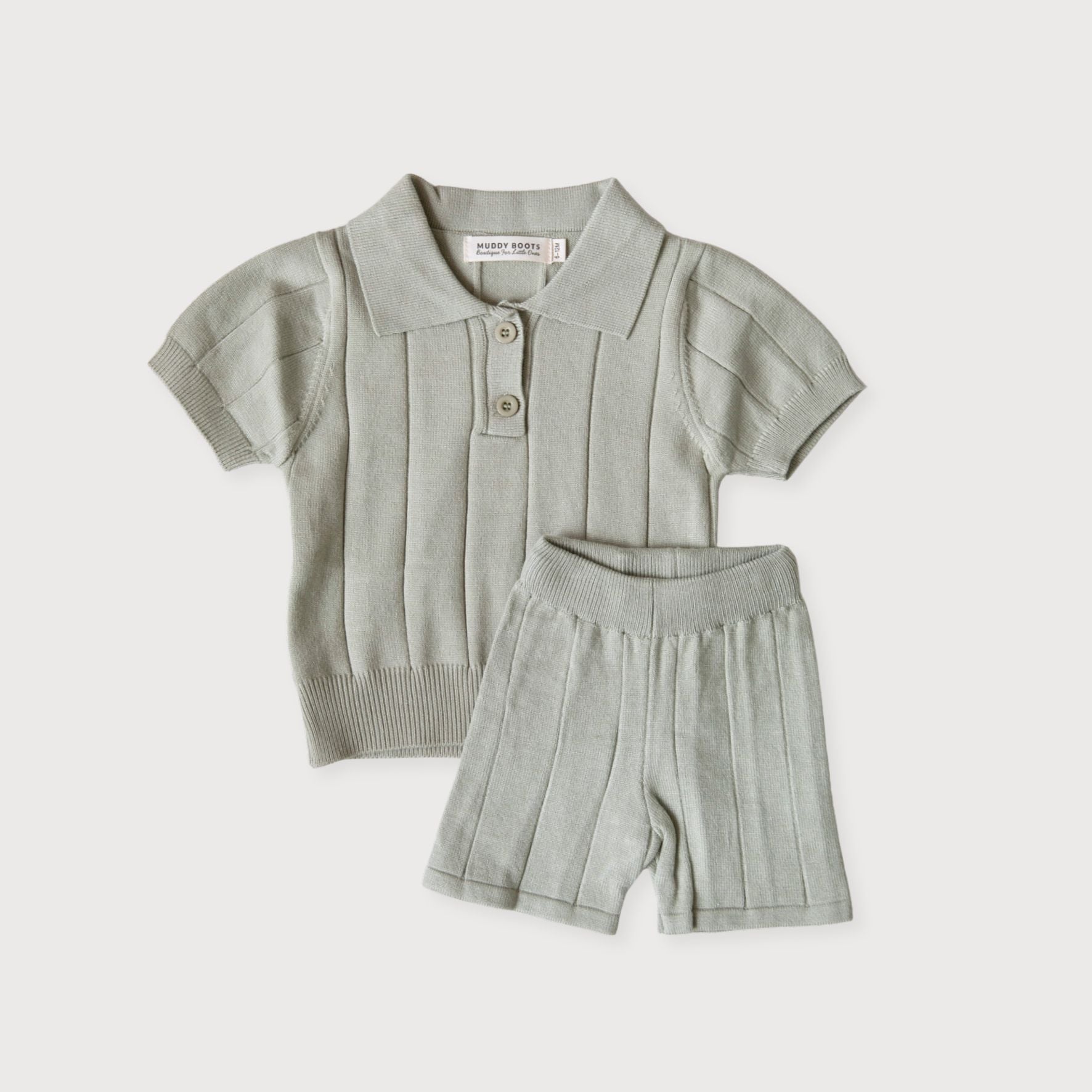Classic comfort with a modern twist. This sage green two-piece set includes a ribbed knit polo top with buttons and matching ribbed shorts. Ideal for layering with tights or cardigans during autumn and winter, it’s a versatile outfit that blends style with everyday ease.