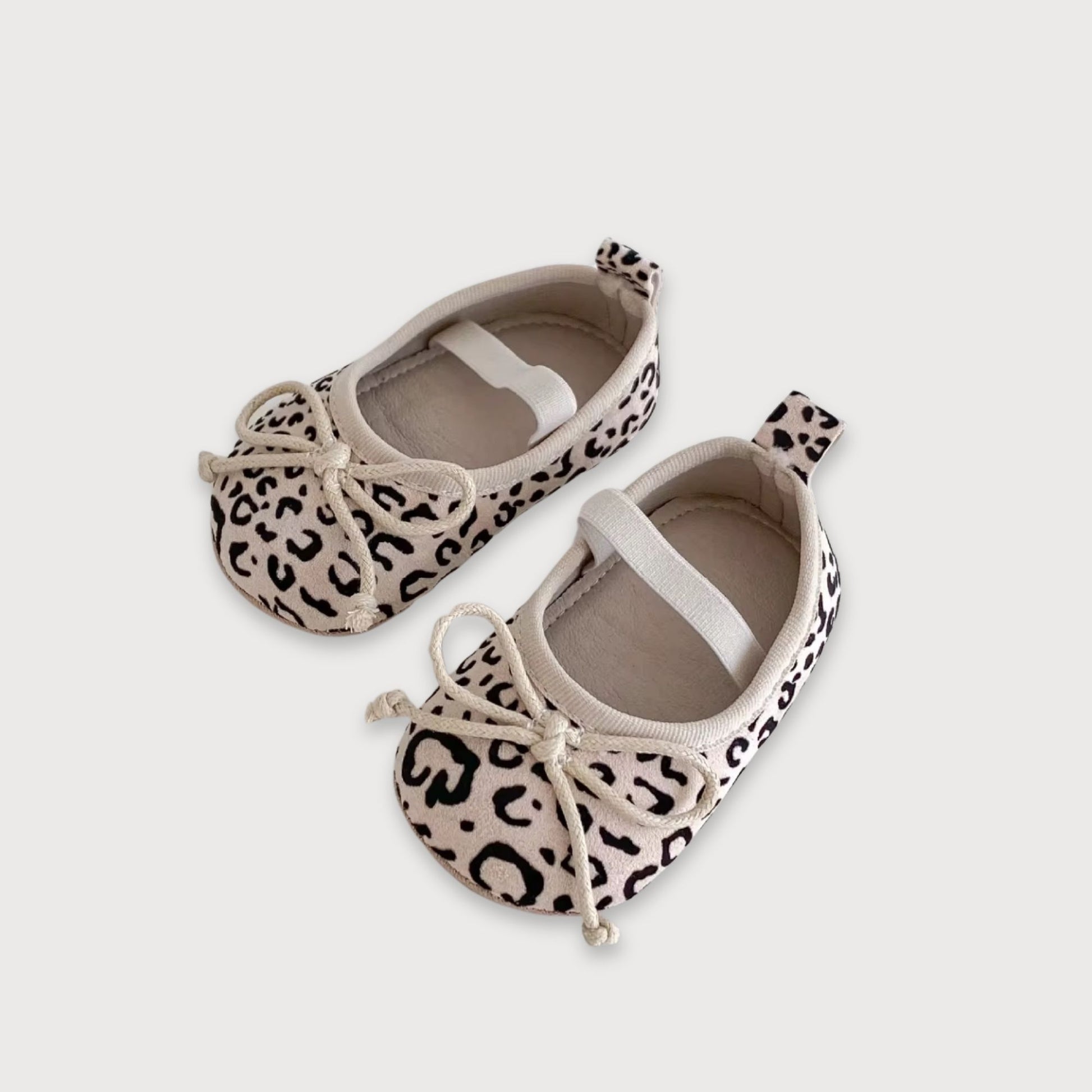 These leopard print baby ballet shoes bring a little extra sass to any outfit. Designed with a soft sole and comfy elastic strap to help them stay put on wriggly feet, they’re the perfect mix of cute and practical. The sweet bow detail at the front adds a classic finish—ideal for parties, prams, or just stomping around in style.