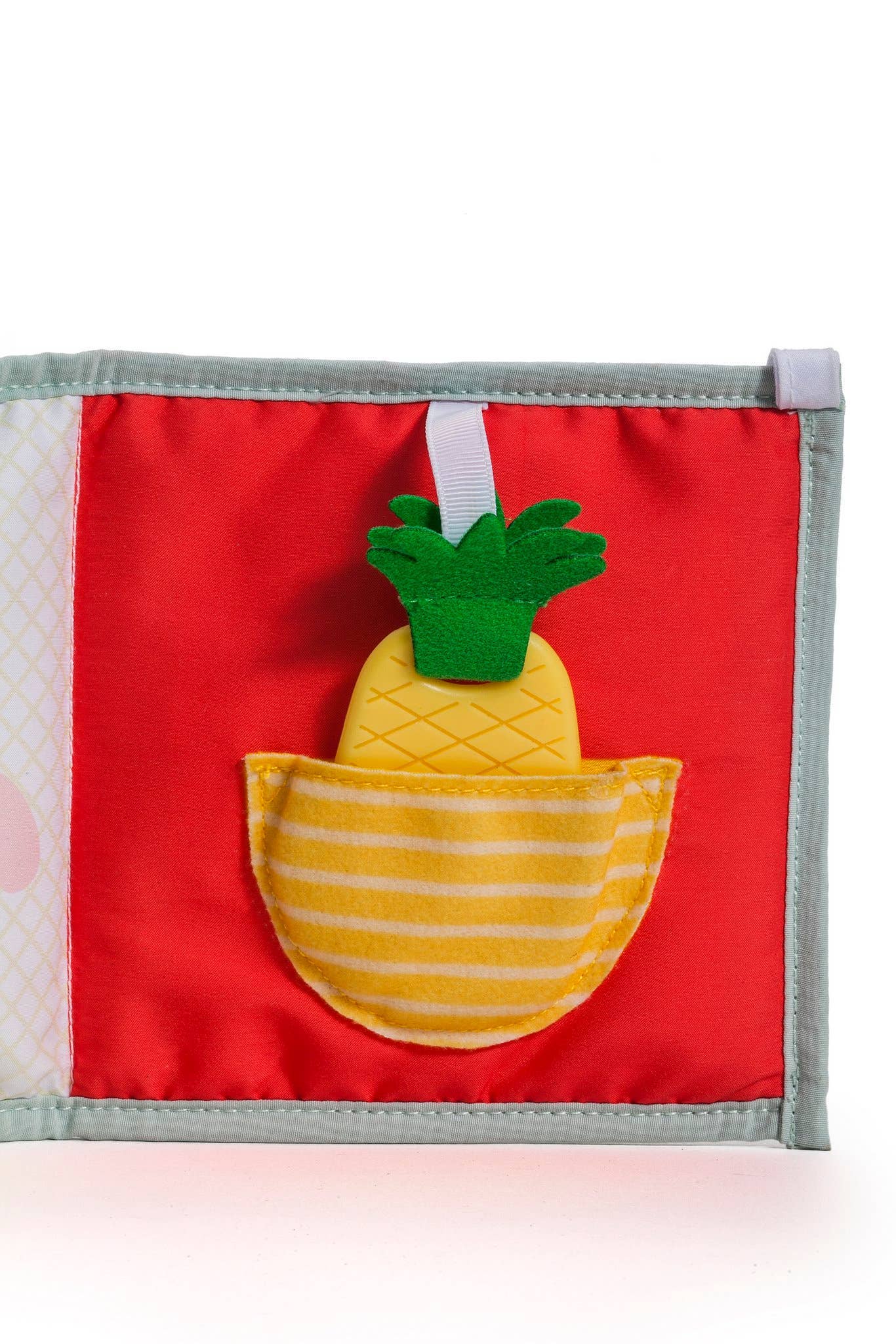 - Side 2: Vibrant colors, varied textures, and interactive 3D activities—including a pineapple teether and play pocket—enhance fine motor skills and sensory exploration.